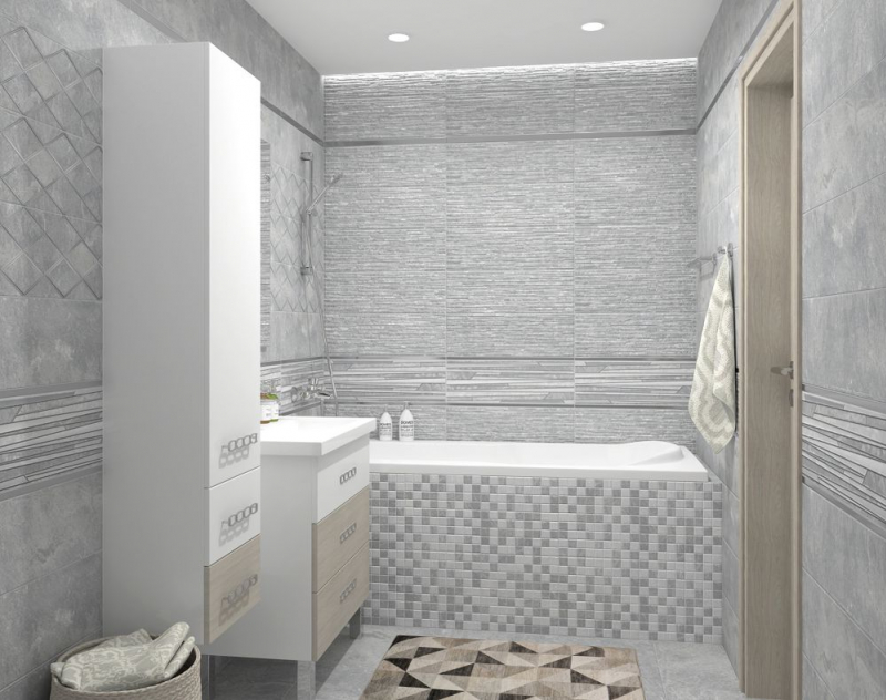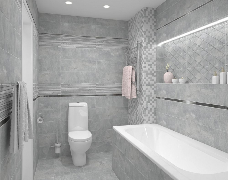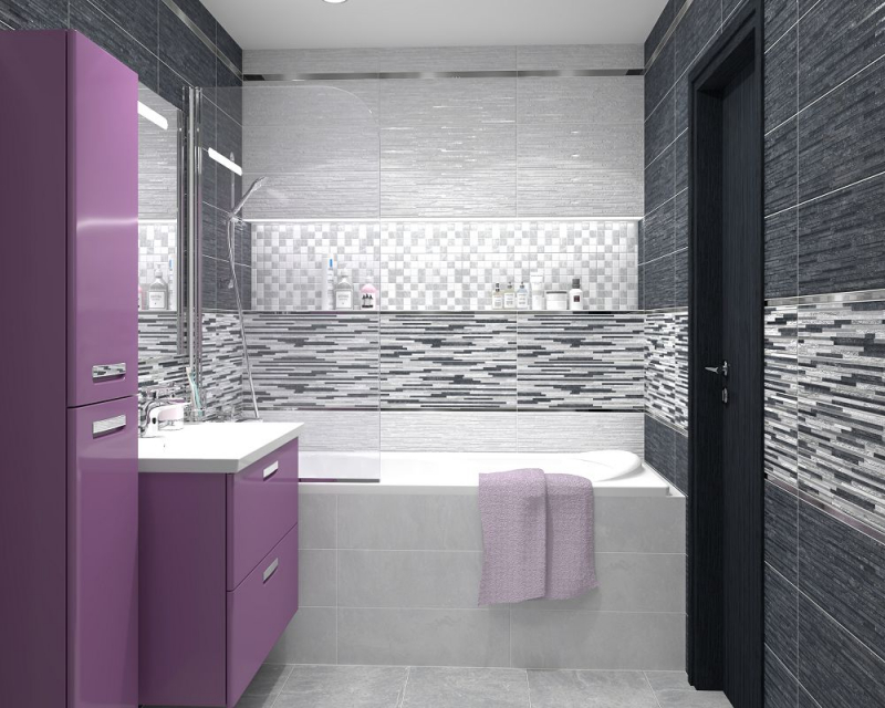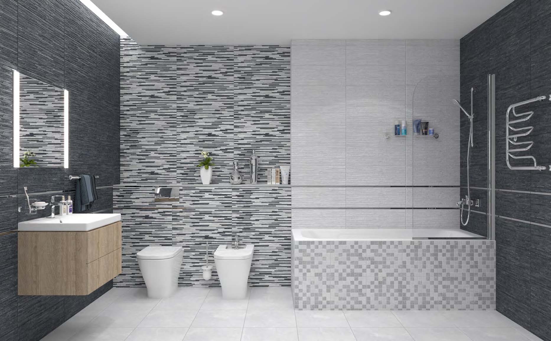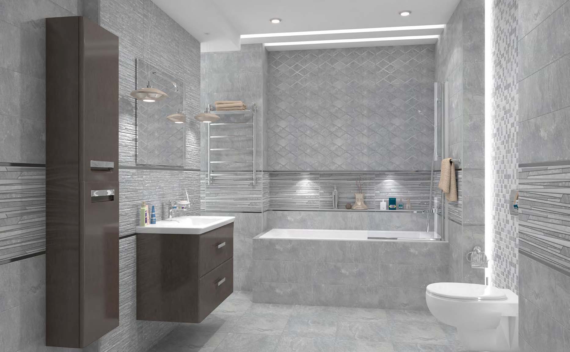 В качестве декоративных модулей дизайнеры предлагают плитку Tresor состоящую из длинных плашек разного размера и цвета, а также ромбовидный орнамент Attimo с контрастным контуром, выполненные на матовой плитке. Настенный бордюр в серебряном цвете поможет выделить зоны и расставить акценты.