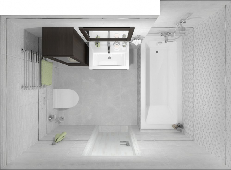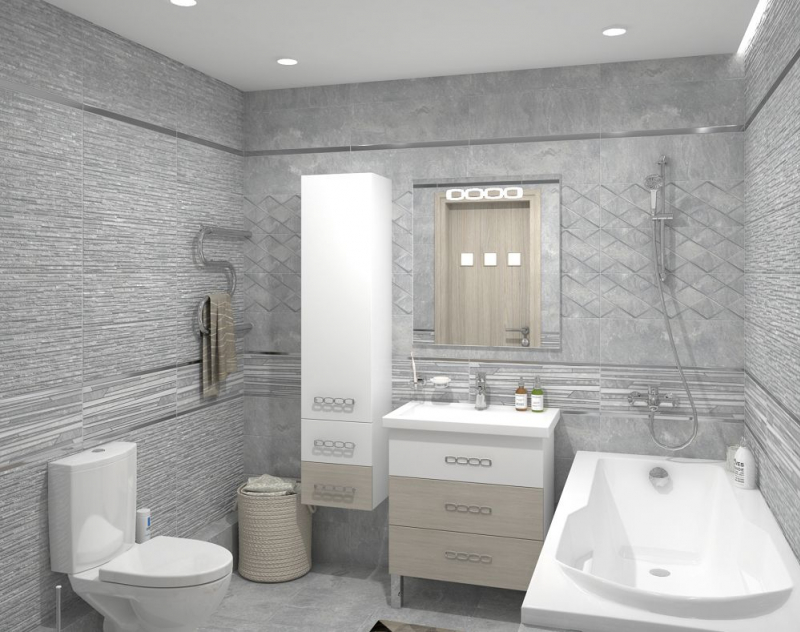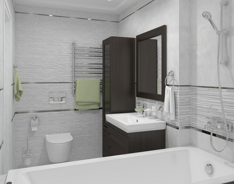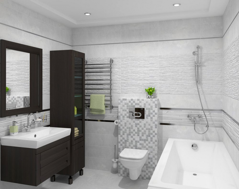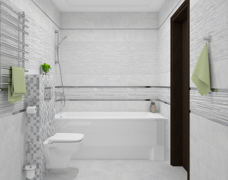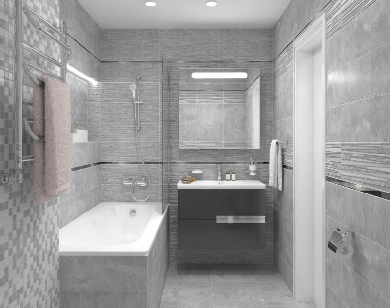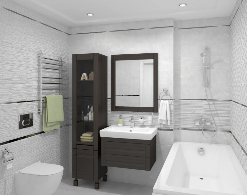 В качестве декоративных модулей дизайнеры предлагают плитку Tresor состоящую из длинных плашек разного размера и цвета, а также ромбовидный орнамент Attimo с контрастным контуром, выполненные на матовой плитке. Настенный бордюр в серебряном цвете поможет выделить зоны и расставить акценты.